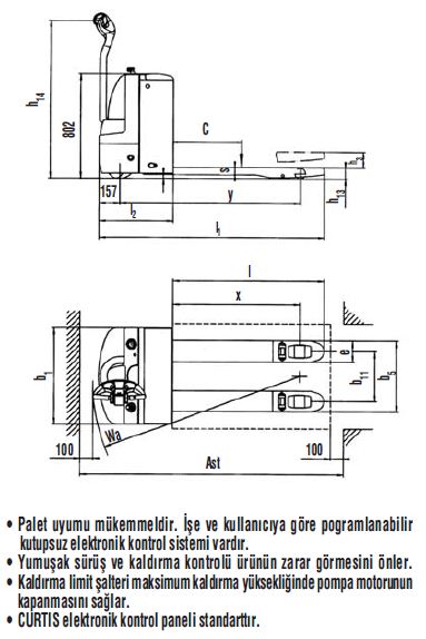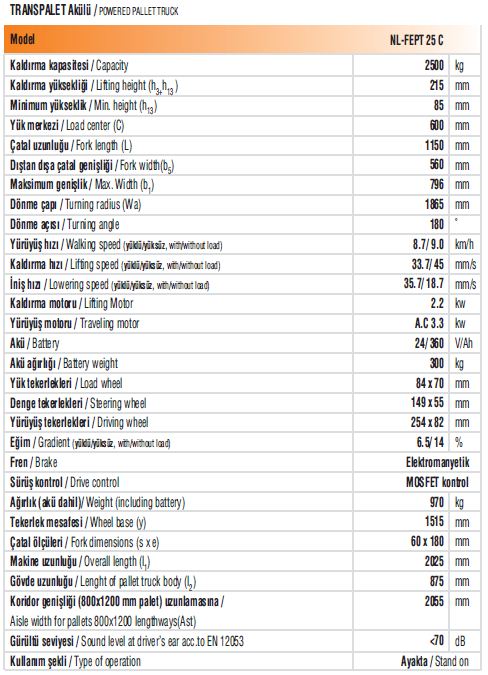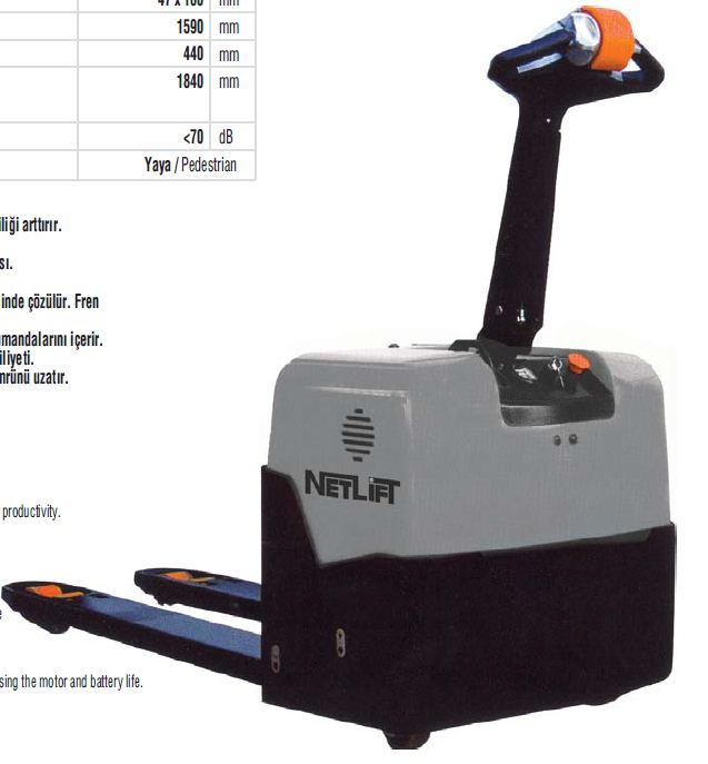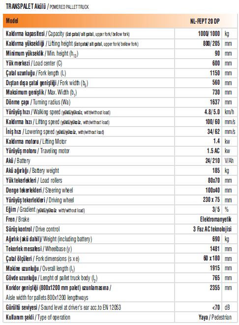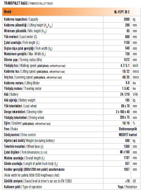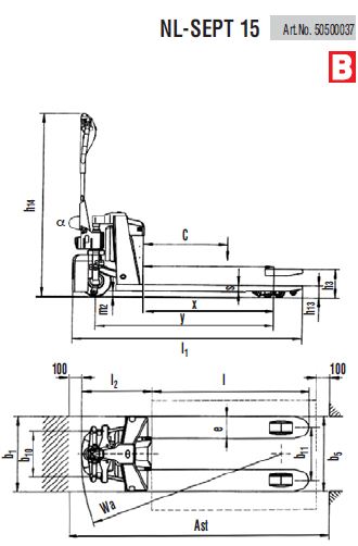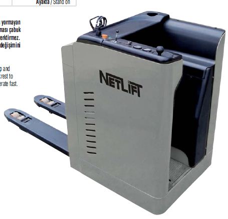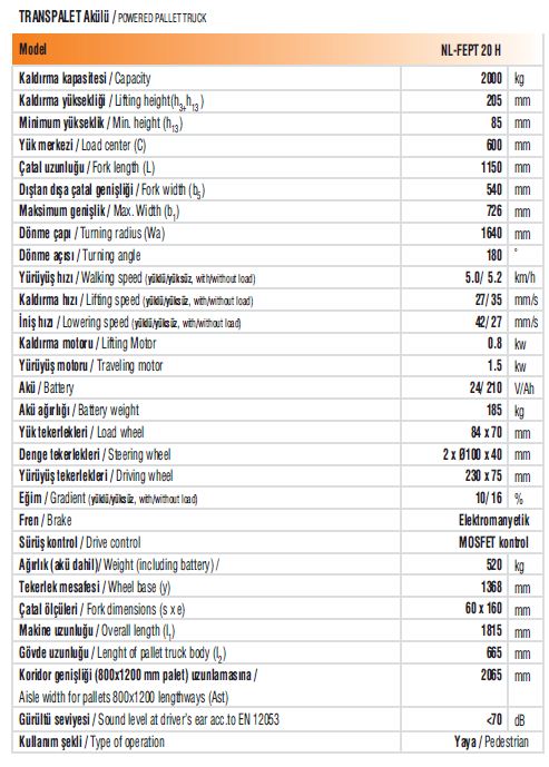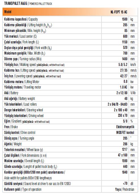 NL-SEPT 15 yarı otomatik transpaletler, normal hidrolik transpalet sisteminden geliştirilmiştir. Bu ürün ile birlikte yürütme işlemi bir motor sayesinde gerçekleşir. Bu sayede iş akışına hız katan bir üründür. Hoz kontrol sistemi kutupsuzdur. Diğer benzerleri 1000 kg kapasiteye ulaşabilirken ürünümüz 1500 kg ye sahiptir.