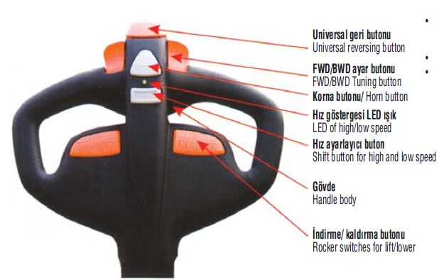 Ergonomik olarak tasarlanmış kontrol kolu kaldırma, indirme ve korna kumandalarını içerir