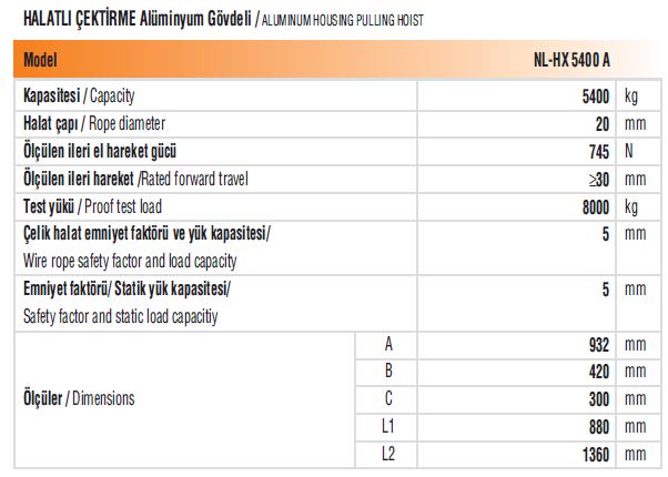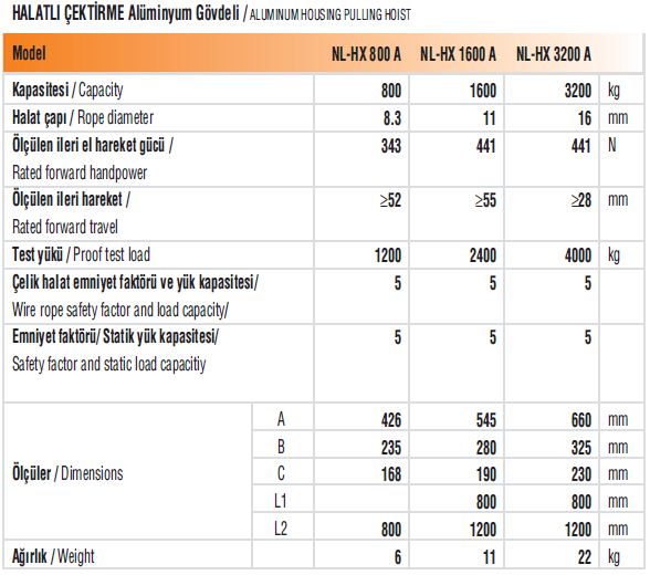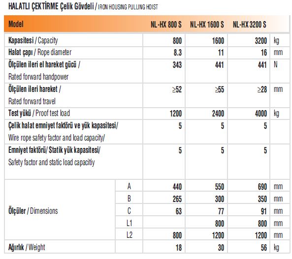 Hafif, küçük ve sağlam alüminyum gövde. Ön koldaki pim mekanizması ile sağlanan aşırı yük koruma sistemi. Taşıma kolunda veya operasyon levyesinde yedek makas pimleri. Çelik halatın kolayca monte edilmesini sağlayan mekanizma. Birim harekette uzun halat hareketi. Testi %150 aşırı yükte yapılmıştır. Temizlik için rahat açıklık. Makine emniyet yönetmeliği 2006/42 EC ye uygun üretilmiştir. Özel siparişlerde çelik halat seti ile teslim. Standart çelik halat uzunluğu 20 ve 30 metredir.